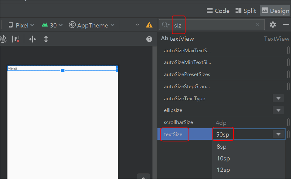 속성 검색창에 size를 입력하여 textSize(글자 크기) 속성을 찾아서 값을 50sp로 입력하고 엔터키를 친다.