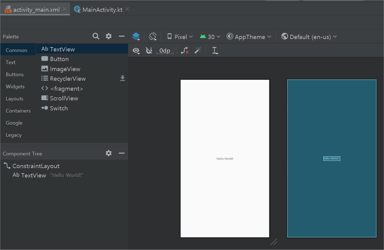 새 프로젝트를 만들면 코드를 입력하는 기본 클래스인 MainActivity.kt 파일과 View(뷰)의 배치를 보여주는 activity_main.xml 이라는 layout(레이아웃) 파일이 만들어 진다.